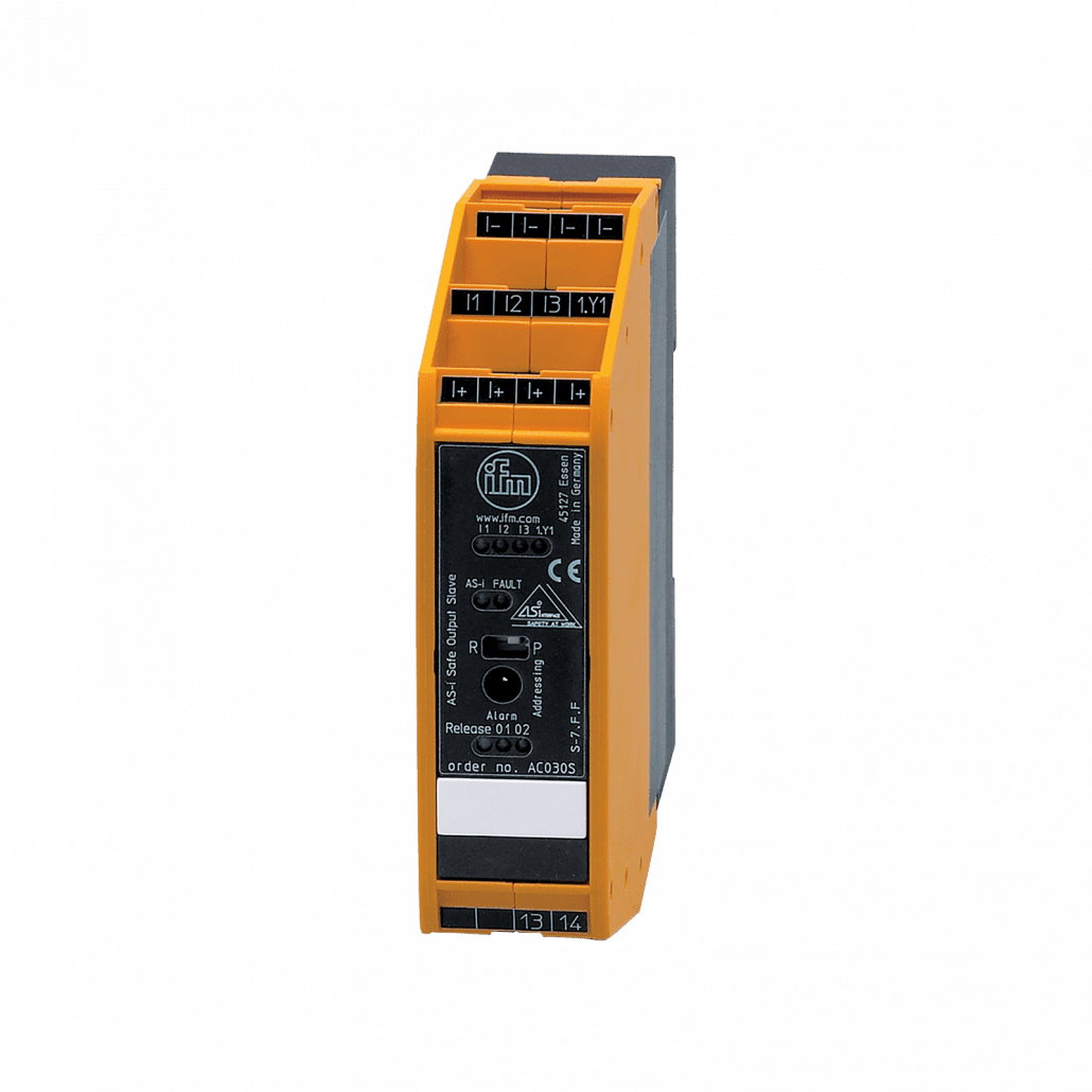 This IFM Safe AS-Interface control cabinet module is designed for use in industrial automation and control applications.