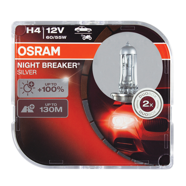 OSRAM offers a performance halogen automotive lamp with an optimized lifetime. OSRAM NIGHT BREAKER SILVER generates up to 100% more brightness compared to the minimum legal standard and a beam which is up to 130 meters long. This allows you to see road signs, obstacles and hazards sooner and the driver is left with more time to react.